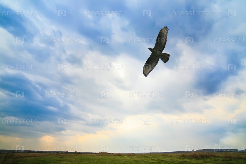 Орел летит в облачном небе