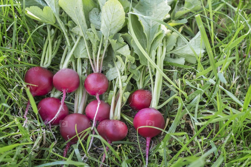 Куча свежей красной редьки с листьями на зеленой траве в саду. Сбор урожая
