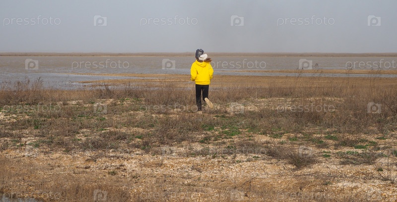 Подросток идет вдоль залива по песчаному, травяному берегу. Дикая природа, не тронутая человеком