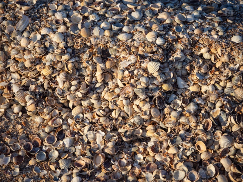 Абстрактный текстурированный естественный фон для дизайна на тему морского отдыха. Много мелких ракушек крупным планом селективный фокус малой глубины резкости. Толстый слой ракушки в горизонтальной плоскости