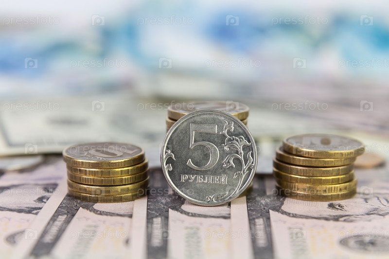 Стопка монет и монета в пять российских рублей
