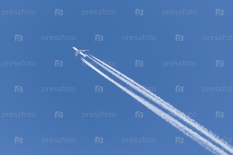Реактивный самолет с четырьмя двигателями оставил инверсионный след в чистом небе