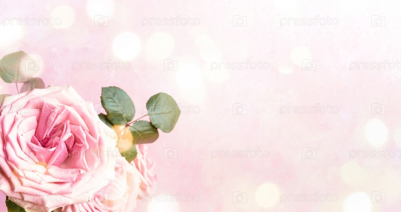 Розовые розы на нежном пастельно-розовом фоне с огнями боке. Цветочный праздничный баннер для романтического праздника или весеннего образа. День святого Валентина, День матери, женский день, свадьба. Закрыть. Копировать пространство