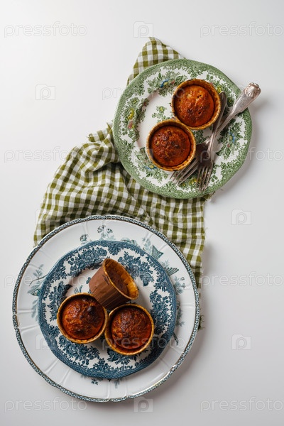 Вкусные кексы с апельсином и орехами в винтажных тарелках на белом столе. Вид сверху. Украшен текстилем и столовыми приборами