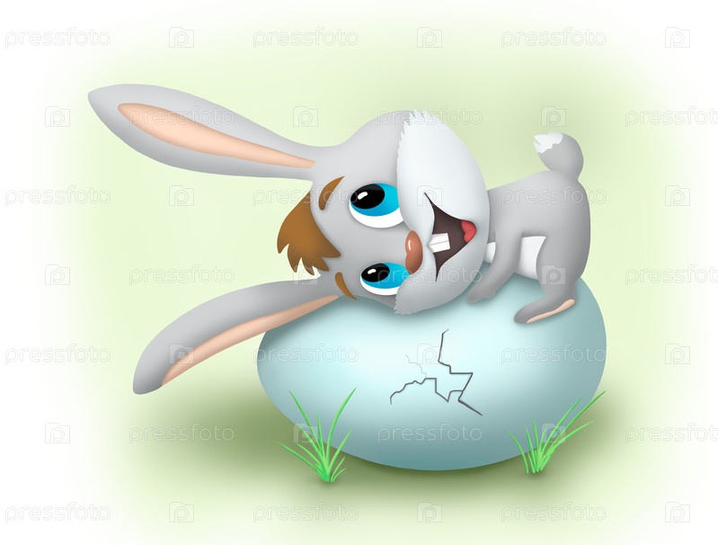 Пасхальный кролик и яйцо. Улыбающийся мультяшный кролик на голубом яйце слушает треснувшую яичную скорлупу. Христос воскрес