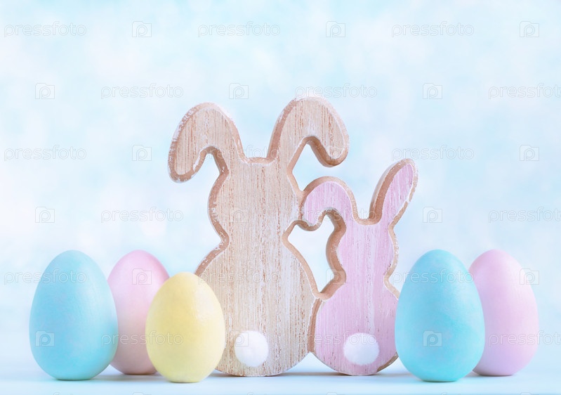 Силуэты пасхальных кроликов со спины с цветными пастельными яйцами. Мягкий фокус, пространство для копирования