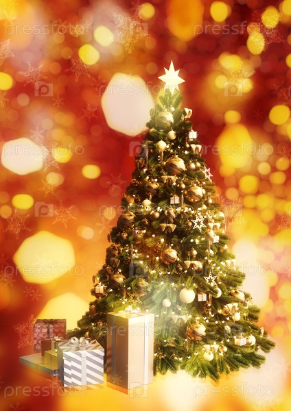 Рождественская елка с подарочными коробками и боке