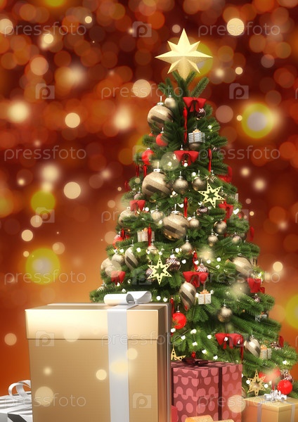 Рождественская елка с подарочными коробками и боке