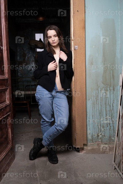 Молодая красивая женщина позирует в черной куртке и джинсах в квартире
