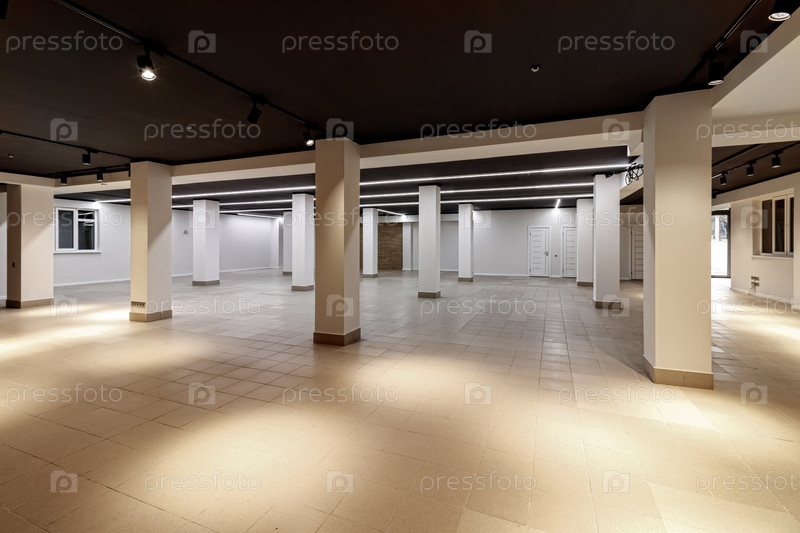 Большая пустая комната с керамической плиткой на полу, черным потолком с подсветкой и колоннами, растущими по потолку