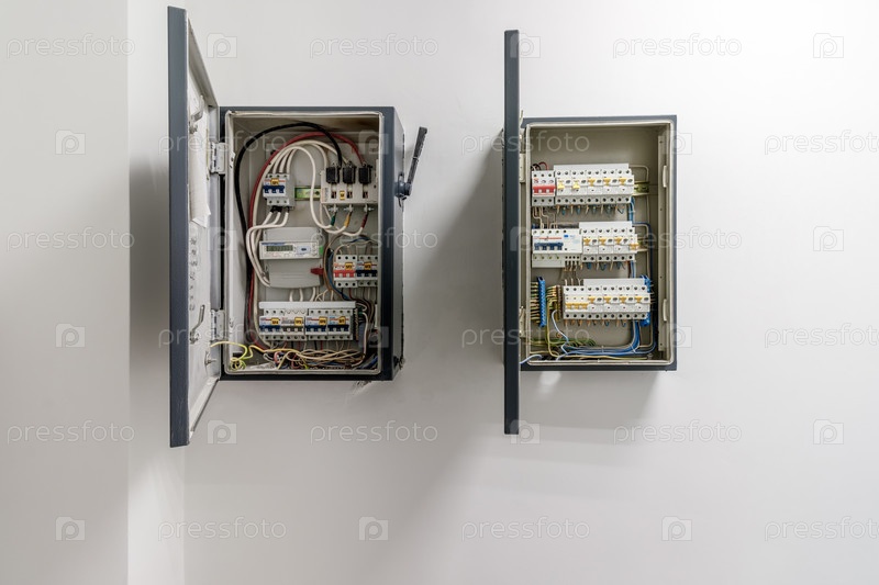 Распределительный щит. комплектное устройство, предназначенное для приема, распределения электрической энергии, включения, отключения линий электропередач, защиты при перегрузках и коротких замыканиях. Счетчик электроэнергии. на белой стене