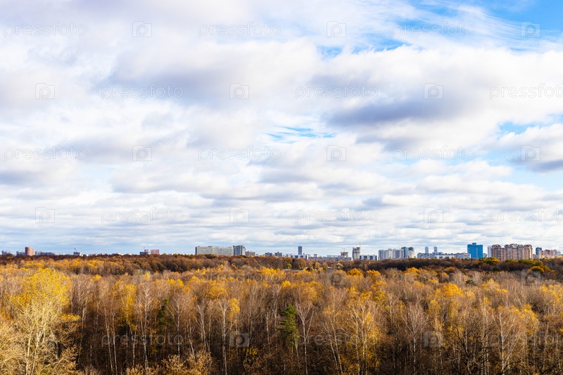 Облачное небо над лесом и городом осенью