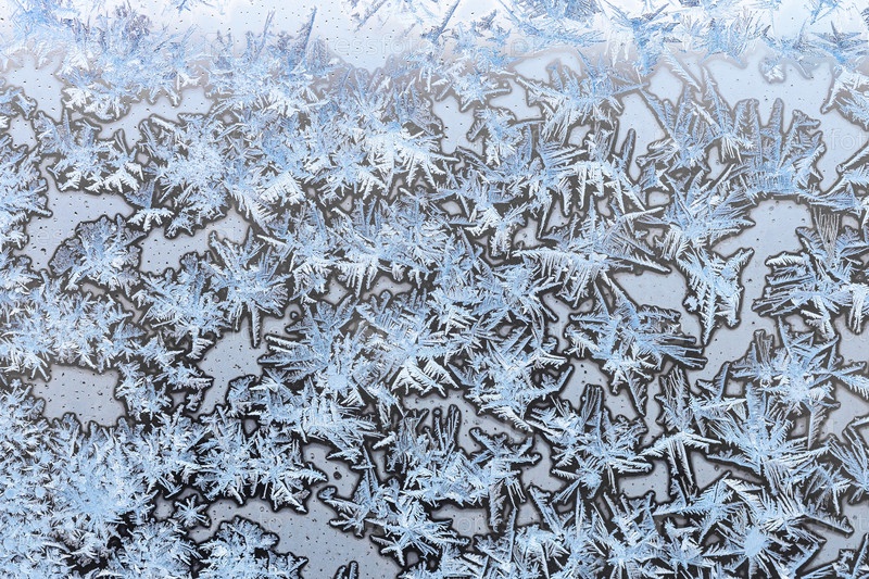 Синий замороженный лед на поверхности окна дома крупным планом