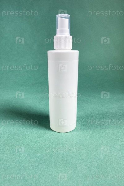 Одна белая пустая пластиковая бутылка с распылителем на зеленом