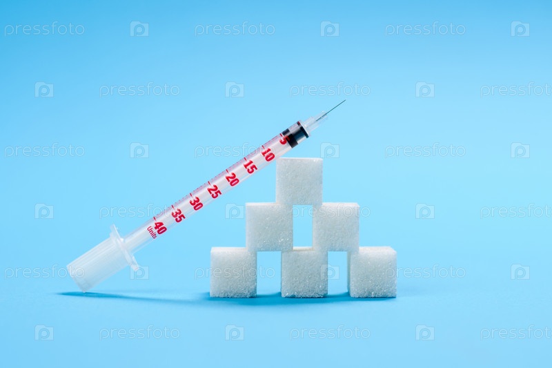 Инсулиновый шприц лежит на пирамиде из белых кубиков сахара на синем фоне. Концепция сахарной зависимости и развития сахарного диабета