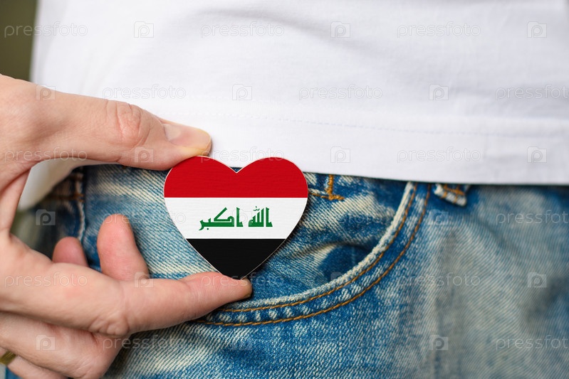 Деревянный значок с иракским флагом в форме сердца в мужской руке