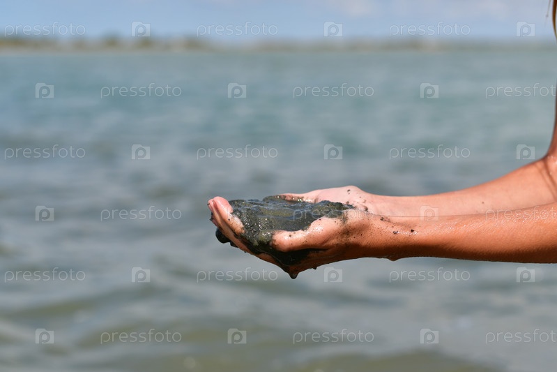 Черная лечебная грязь из озера в руках. На заднем плане целебное соленое озеро