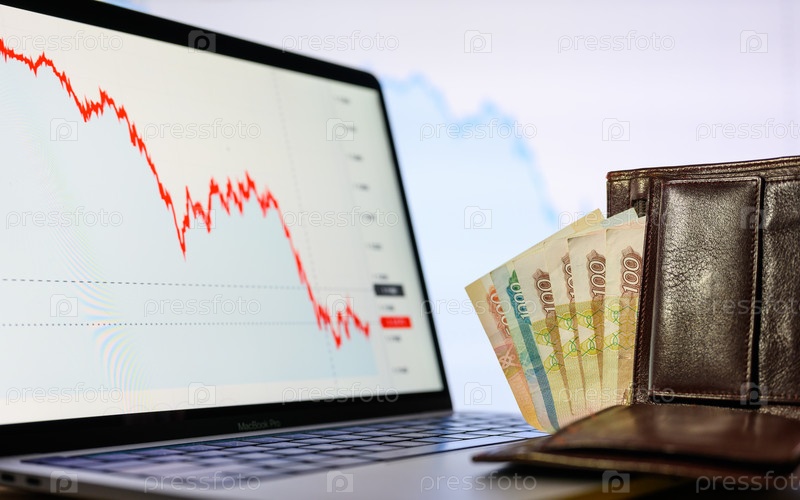 Владимир, Россия - февраль 2022 года: российские деньги в кошельке на фоне снижения финансовых диаграмм. Понятие о кризисе в России и обесценивании денег. Селективный фокус на деньгах