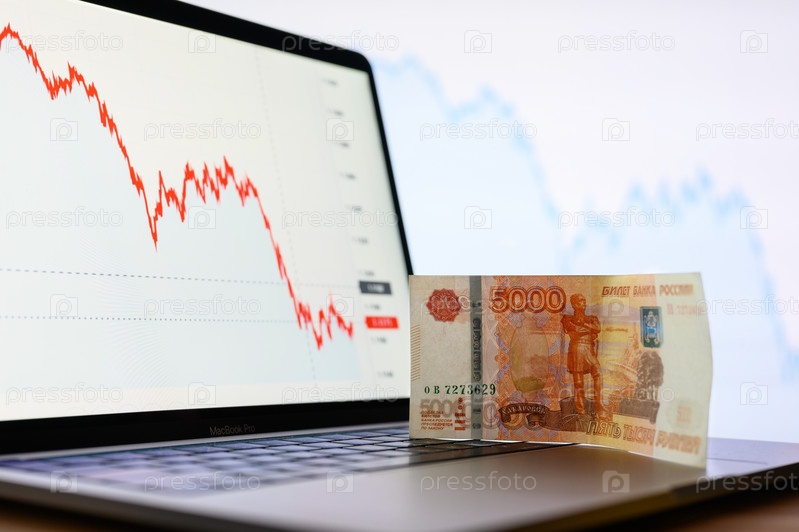 Владимир, Россия - февраль 2022 года: банкнота 5000 рублей на фоне уменьшающихся графиков на мониторах. Обесценивание рубля в условиях мирового кризиса и введения международных санкций. Выборочный фокус