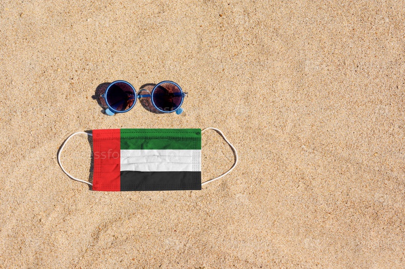 Медицинская маска цвета флага Объединенных Арабских Эмиратов лежит на песчаном пляже рядом с очками. Концепция организации безопасного пляжного отдыха в ОАЭ в период пандемии коронавируса