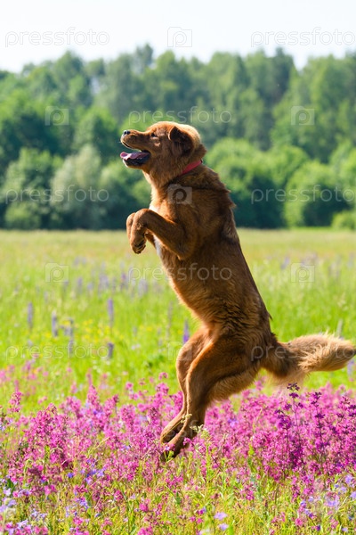 Большая рыжая собака высоко прыгает по полю с цветами. Вертикальный портрет. Собака породы мастиф