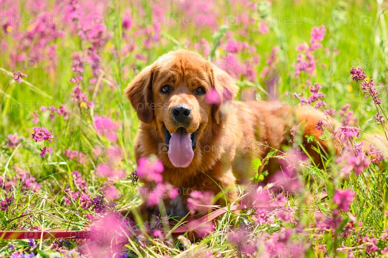 Позитивная собака породы мастиф лежит в траве с розовыми цветами