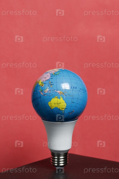 Лампочка с моделью планеты Земля с пространством для текста. Глобальная экология, Международный день энергосбережения или концепция "Час Земли". На коралловом фоне