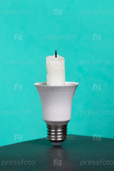 Лампочка с огарком свечи. Глобальная экология, Международный день энергосбережения или концепция "Час Земли". На бирюзовом фоне