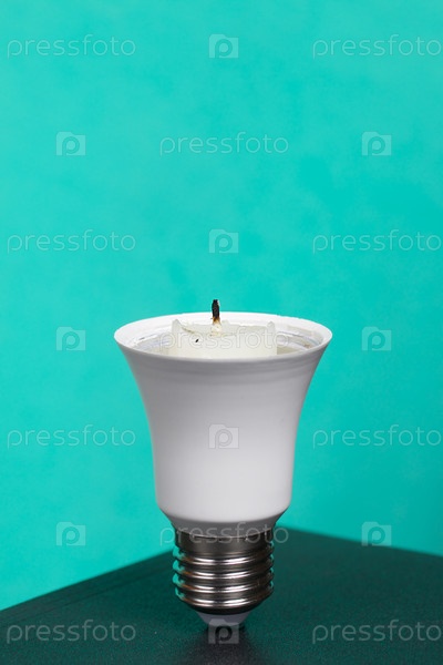 Лампочка с огарком свечи. Глобальная экология, Международный день энергосбережения или концепция "Час Земли". На бирюзовом фоне