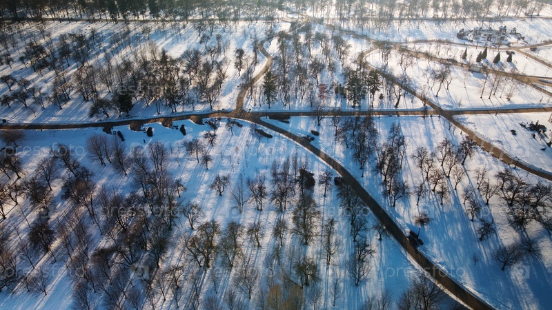 Извилистая велосипедная дорожка в городском парке. Городской парк зимой. Снег лежит на земле. Аэрофотосъемка