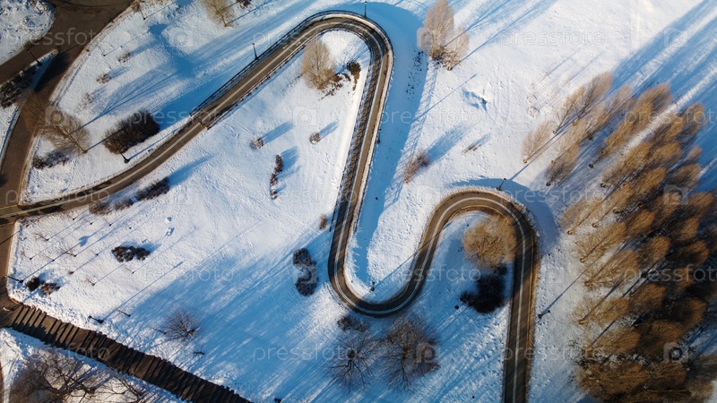 Извилистая велосипедная дорожка в городском парке. Городской парк зимой. Снег лежит на земле. Аэрофотосъемка