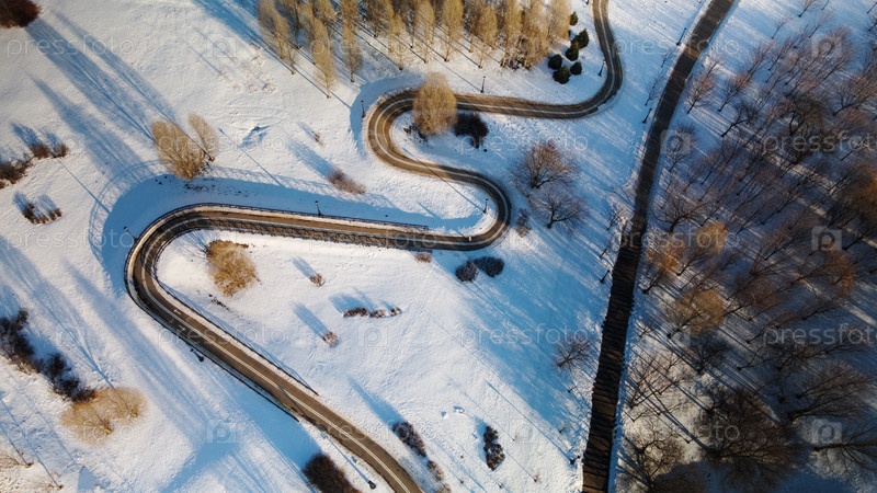 Извилистая велосипедная дорожка в городском парке. Городской парк зимой. Снег лежит на земле. Аэрофотосъемка