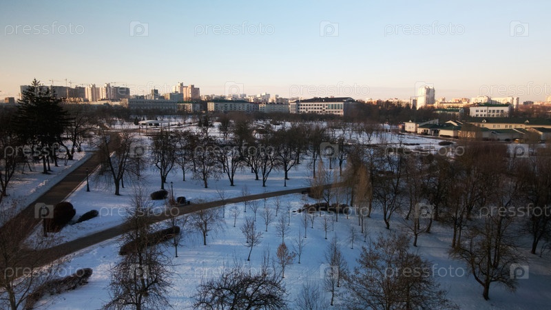 Извилистая велосипедная дорожка в городском парке. Городской парк зимой. Снег лежит на земле. Аэрофотосъемка