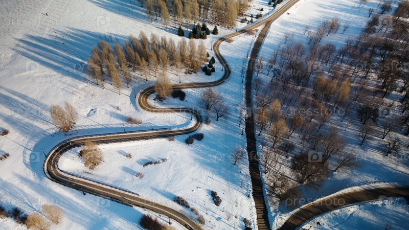 Извилистая велосипедная дорожка в городском парке. Городской парк зимой. Снег лежит на земле. Аэрофотосъемка
