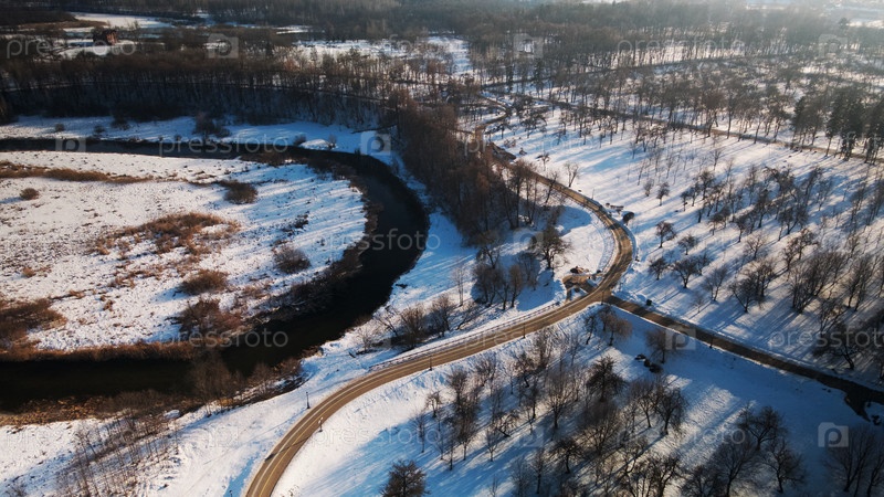 Городской парк зимой. Снег лежит на земле. Течет извилистая река. Аэрофотосъемка
