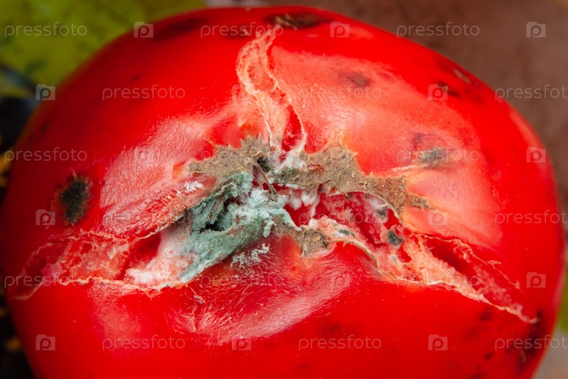 Гнилой разбитый красный помидор с плесенью крупным планом вид сверху. Плохой овощ с болезнью
