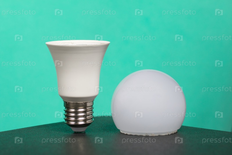 Разобранная светодиодная лампа. Глобальная экология, Международный день энергосбережения или концепция "Час Земли". На бирюзовом фоне