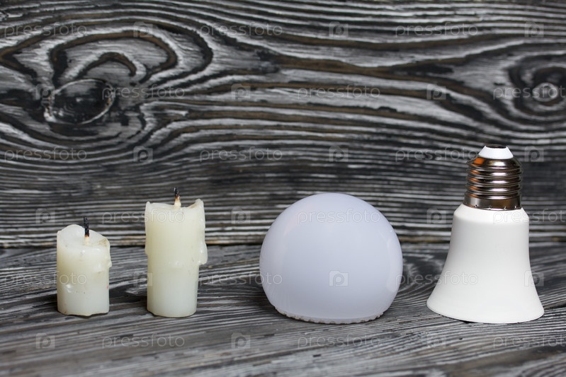 Разобранная светодиодная лампа. Рядом огарок свечи. Глобальная экология, Международный день энергосбережения или концепция "Час Земли". На фоне черных досок