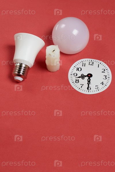 Разобранная светодиодная лампа. Рядом огарок свечи. Циферблат со стрелками в 20:30. Глобальная экология, Международный день энергосбережения или концепция "Час Земли". На коралловом фоне