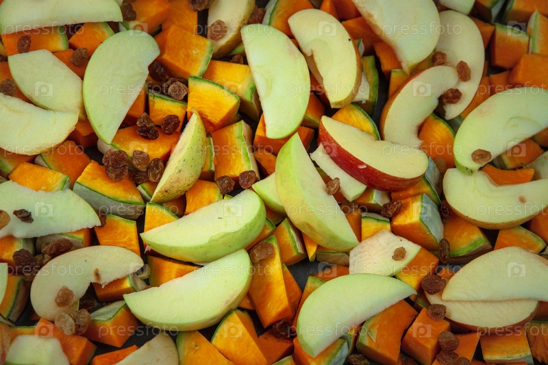 Смесь нарезанной тыквы, нарезанных яблок и изюма готова к отправке в духовку. Концепция здорового образа жизни, веганская диета