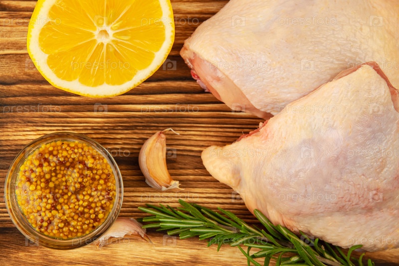 Сырые куриные бедра со свежей веткой розмарина, чесноком, лимоном и горчицей на деревенской деревянной доске