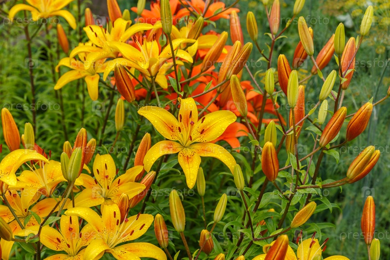 Лилия. Желтые цветущие цветы с каплями воды на лепестках