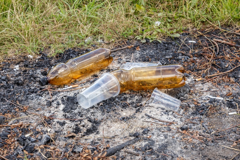 Использованные пластиковые бутылки и стаканы. Загрязнение природы. Мусор для пикника