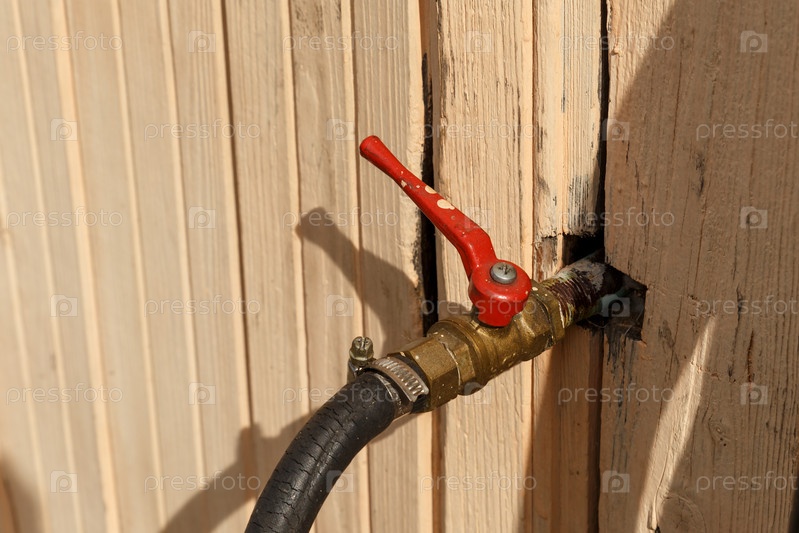 Водопроводный кран торчит из стены дома. Железный водопроводный кран с красной ручкой и черным шлангом
