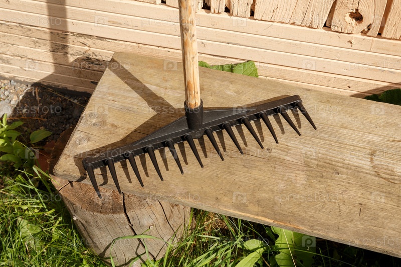 Черные грабли стоят на деревянной скамье у стены дома