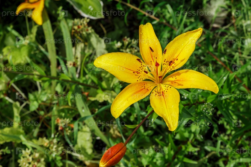 Лилия, желтый цветущий цветок с каплями воды на лепестках. Цветок в саду