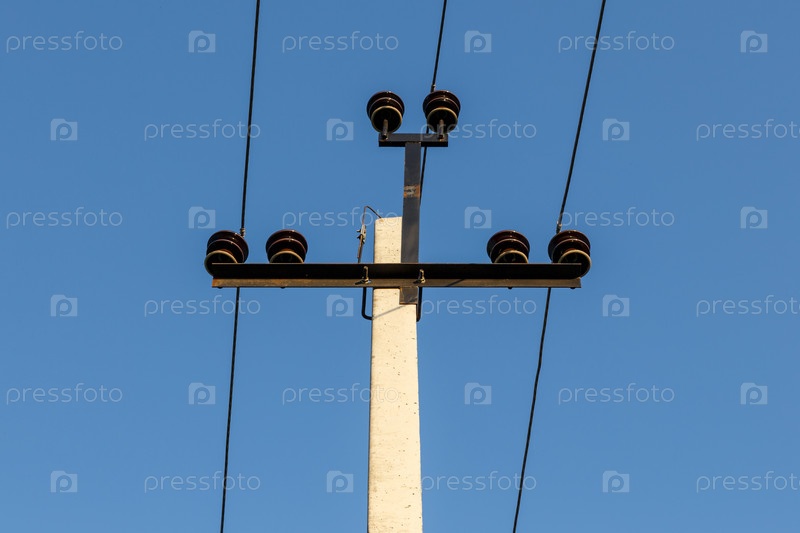 Линия электропередач высокого напряжения. Поддержка линии электропередач и провода. голубое небо