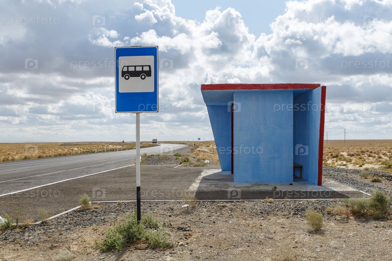 Пустая автобусная остановка, место ожидания автобуса в степи Казахстана