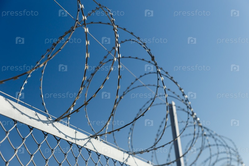 Забор с колючей проволокой, колючая проволока на фоне голубого неба