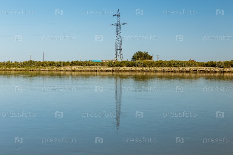 Пилон линии электропередач стоит на берегу реки Сырдарья, отражается в воде, Казахстан. ЛЭП пересекает реку